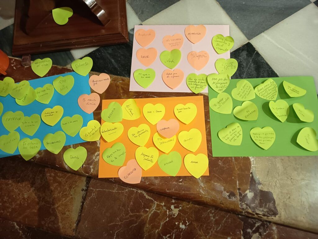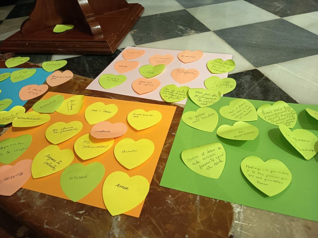 Uno de los momentos más entrañables de la celebración fue la dinámica participativa en la que los asistentes escribieron en cartulinas con forma de corazón mensajes inspirados en el lema de este mes, expresando deseos, oraciones y compromisos personales con la misión. Estos corazones fueron ofrecidos durante la misa como símbolo del envío misionero al que todos los bautizados están llamados.