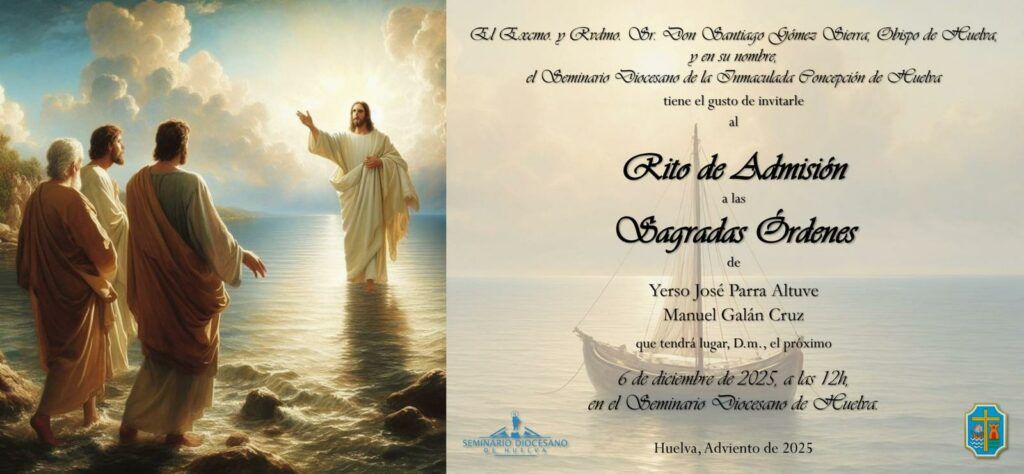 La celebración estará presidida por Mons. Santiago Gómez Sierra, obispo de Huelva, y tendrá lugar a las 12:00 horas en el Seminario Diocesano. En este acto litúrgico serán admitidos a las Sagradas Órdenes los seminaristas Yerso José Parra Altuve y Manuel Galán Cruz.