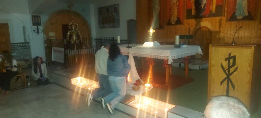 A continuación, cada pareja participó en un momento de oración en un ambiente íntimo, acompañado de música suave y la luz de una vela encendida. Mirando juntos hacia atrás, repasamos la historia que Dios ha escrito con nosotros y respondimos a preguntas que tocaron el corazón: ¿Qué momentos felices recordamos con más cariño?, ¿Qué pruebas hemos superado juntos?, ¿Dónde hemos sentido más claramente la ayuda de Dios?, ¿Qué agradezco hoy de mi cónyuge?.