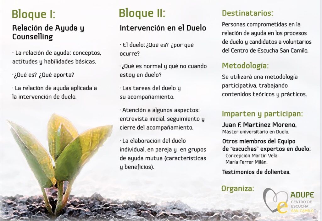 El curso se presenta como una oportunidad para adquirir recursos que faciliten el acompañamiento respetuoso y eficaz en situaciones de duelo, dentro del marco de trabajo que promueve el Centro de Escucha San Camilo de Huelva.